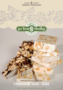 AMANDES ET CHOCOLAT SACHET 150g - référence : 125008 6,20 € TTC BARRE 100g - référence : 125001 2,90 € TTC 6 LES 3 ABEILLES - CATALOGUE 2025-2026 photos non contractuelles PÂTE DE NOUGAT Sans aucun fruit à coque 100g - référence : 110055 2,70 € TTC MA BOÎTE À NOUGATS 400g - référence : 161334 16,40€ TTC SACHET - AMANDES 400g - référence : 131114 9,20 € TTC SAUCISSON - AMANDES 100g - référence : 131062 3,10 € TTC SACHET - 4 PARFUMS (Myrtilles, Écorces d’oranges confites, Cramberries, Caramel beurre salé) (sans amandes) 500g - référence : 161134 15,40 € TTC SACHET - NOUGAT TENDRE Arômes et colorants 100% naturels (citron, framboise, pistache et vanille) 300g - référence : 133133 7,90 € TTC